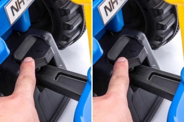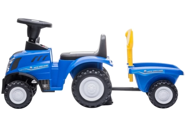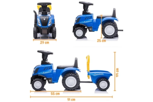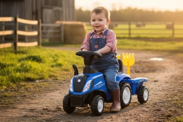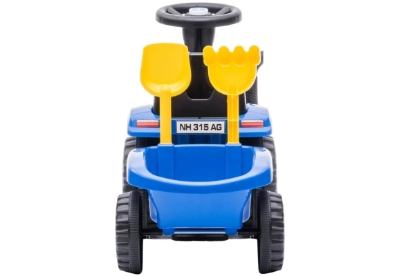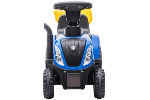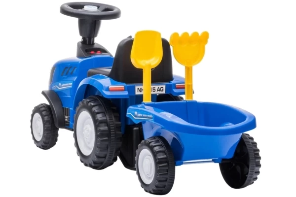 Unter Lizenz von New Holland kann Ihr Kind jetzt eine Mini-Version des T7-Traktors fahren! Der Traktor hat eine Sitzhöhe von 26 cm und wird mit einem passenden Anhänger geliefert. Dieser Anhänger lässt sich leicht abkoppeln und enthält eine Schaufel und einen Rechen. Die vier Räder und der Kippschutz sorgen für zusätzliche Stabilität. Wenn Sie 2 AA-Batterien (nicht im Lieferumfang enthalten) in das Lenkrad einlegen, können die Hupe und die Scheinwerfer verwendet werden. Die maximale Tragkraft beträgt 25 kg.