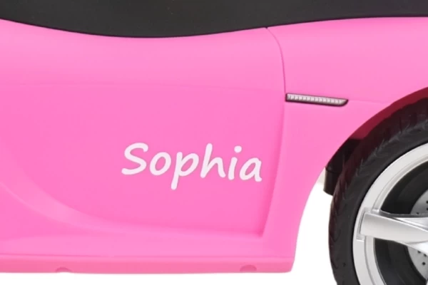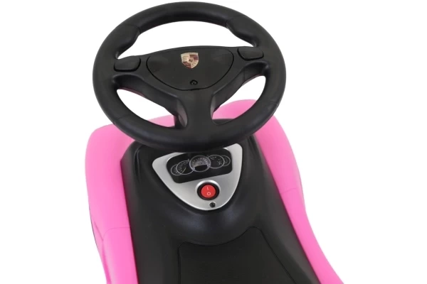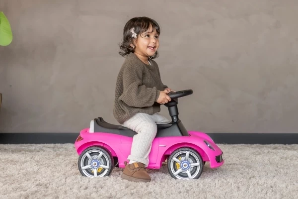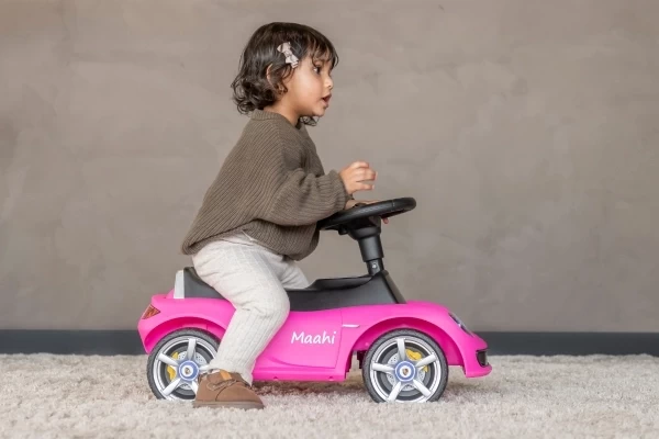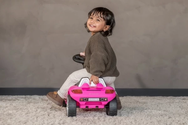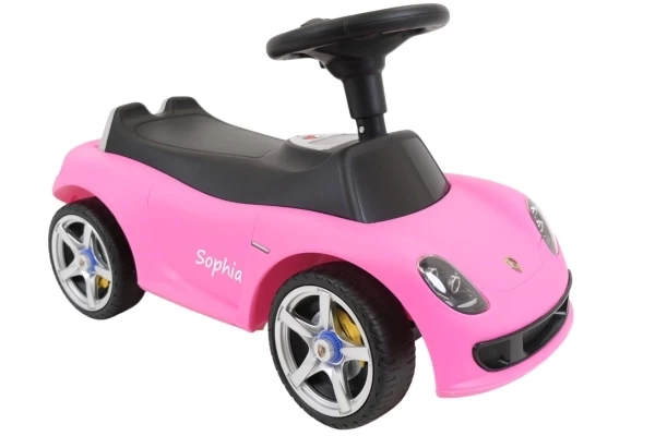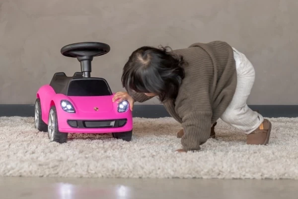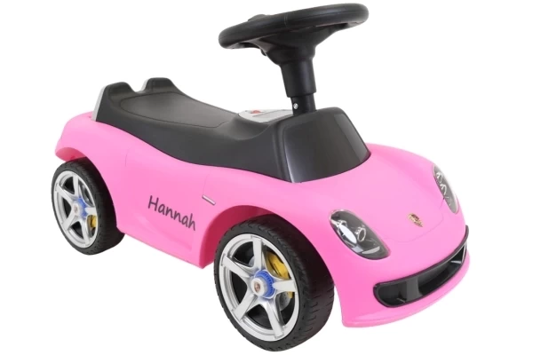 Ein cooles Porsche Carrera GT Rutschauto mit echt funktionierenden Scheinwerfern! Dieser stilvolle rosa Porsche ist für Kinder ab 1,5 Jahren geeignet und sorgt für stundenlangen Spielspaß. Das Rutschauto steht stabil auf weichen Kunststoffrädern, die geräuscharm und kratzfest sind. Dank dieser hochwertigen Räder kann Ihr Kind sowohl drinnen als auch draußen bequem herumfahren. Am Lenkrad befinden sich zwei Knöpfe, mit denen realistische Geräusche aktiviert werden können: eine Hupe und das Startgeräusch des Motors. Bestellen Sie optional einen Namensaufkleber, um das Porsche Rutschauto zu personalisieren! Bitte beachten Sie: Dieses Rutschauto wird ohne 4 AA-Batterien geliefert.
