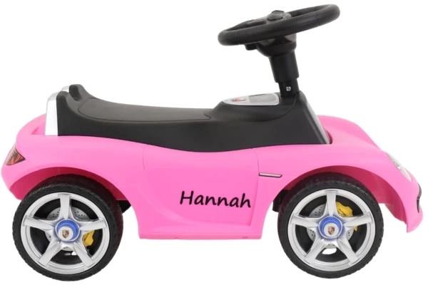 Personalisieren Sie das rosa Porsche Carrera GT Laufauto mit einem eigenen Namen! In diesem Set erhalten Sie zwei schwarze Namensaufkleber, die Sie nach Belieben an den Seiten des Rutschautos anbringen können. Geben Sie einen Namen mit maximal 10 Zeichen ein und machen Sie das Auto zu einem Unikat. Sie erhalten eine klare Schritt-für-Schritt-Anleitung zum einfachen Anbringen der Aufkleber.